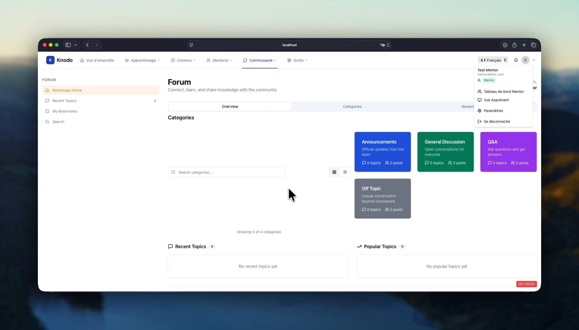 - Navigate to Course Management: From the "Espace Mentor" (Mentor Dashboard), the user navigates to the course management page via the Apprentissage > Mes Cours menu.