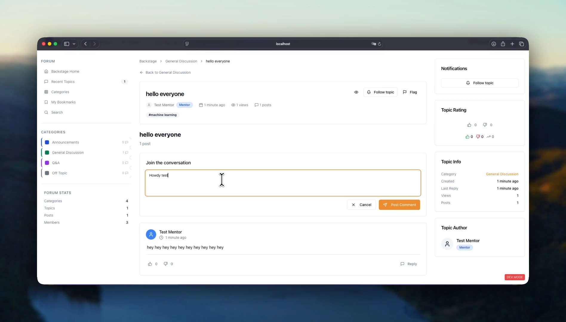 - They create a topic with a Title (hello everyone), select a more appropriate Category (General Discussion), add Content, and apply a Tag (machine learning).